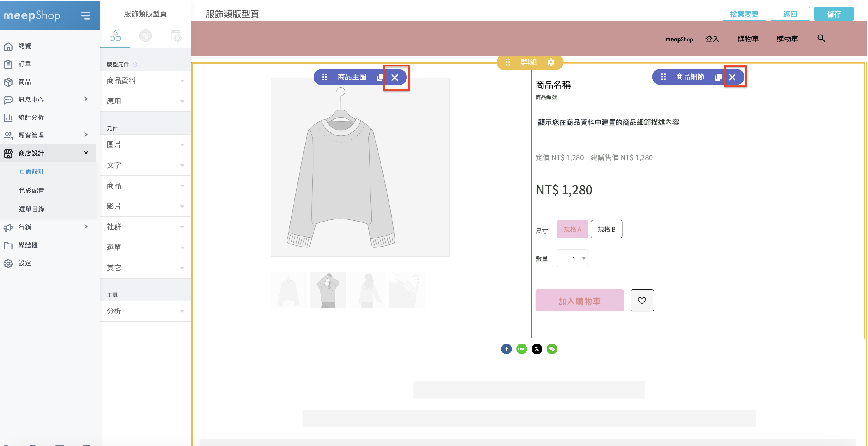 調整完成後,請按右上方儲存,當套用該商品內容頁版型之商品,商品頁就會自動變更喔!