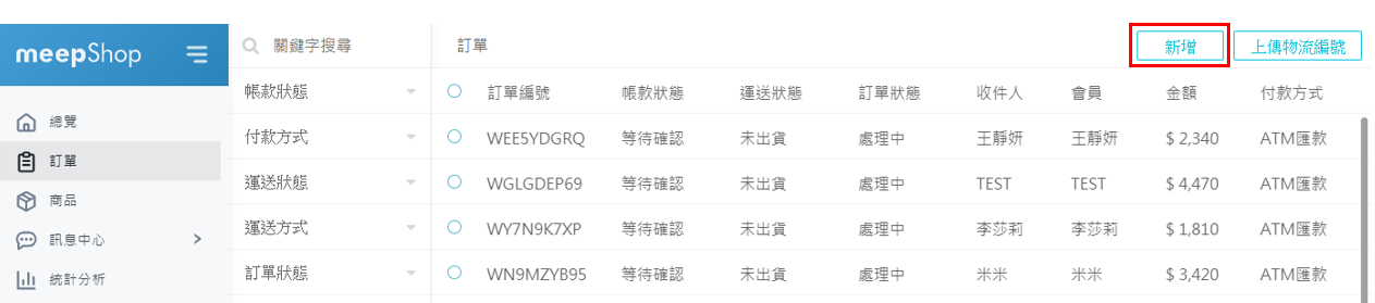Step1 : 進入訂單點選右上方「新增」