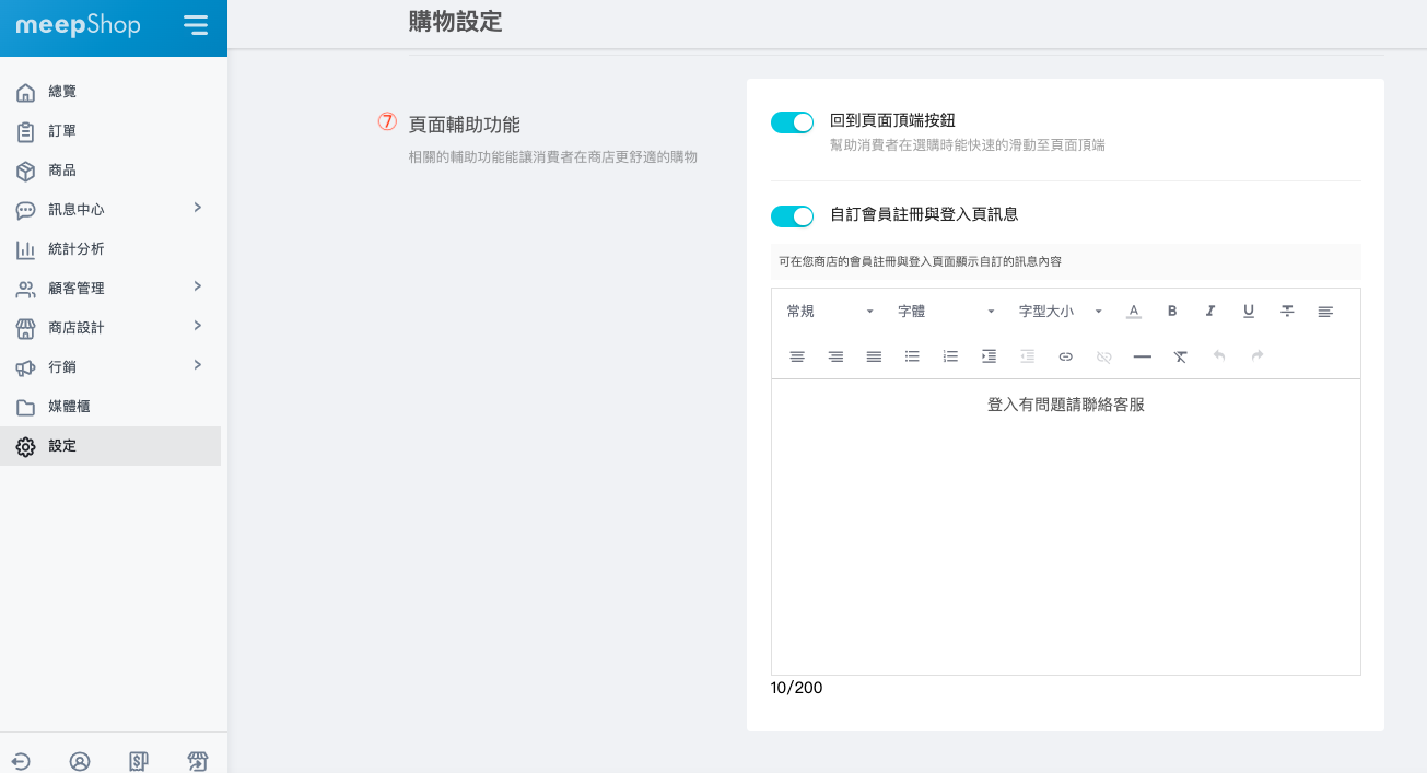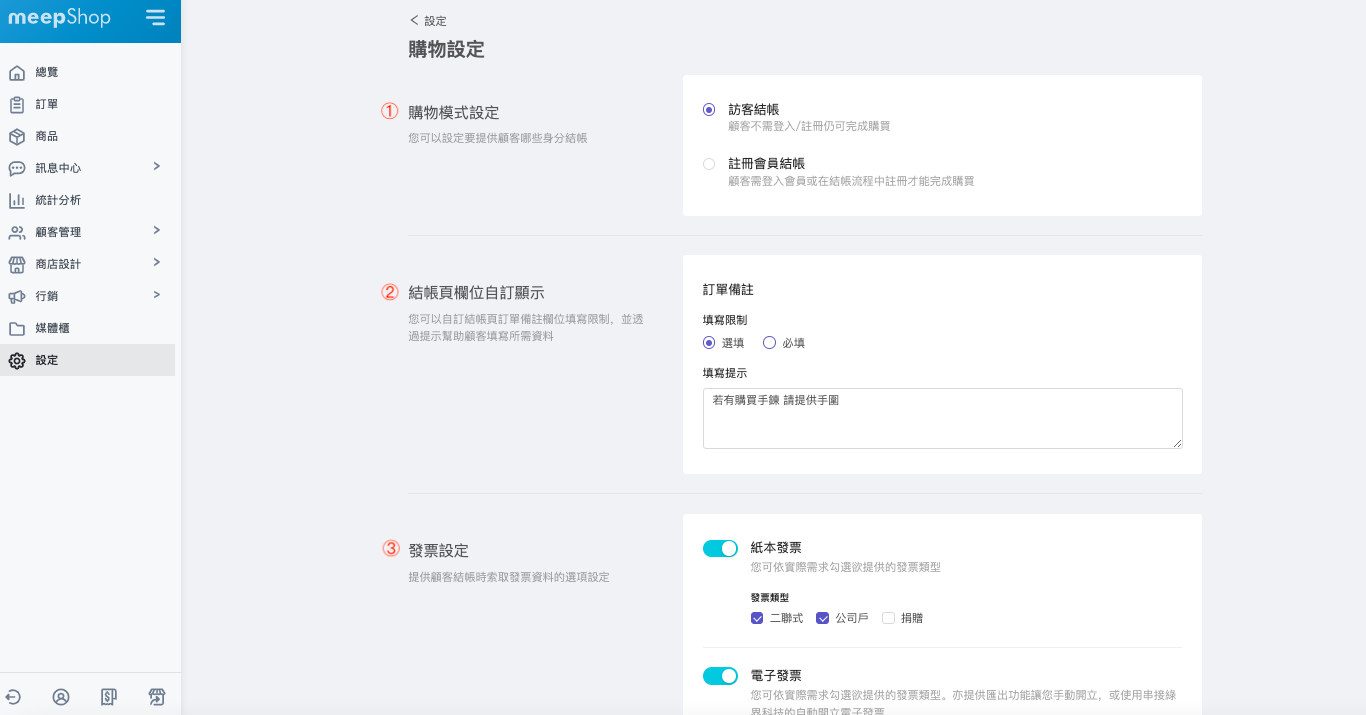 購物設定包含購物模式設定、結帳頁欄位自訂顯示、發票設定、寄件人資訊、運送與結帳設定、訂單管理設定及頁面輔助功能 7個區塊。