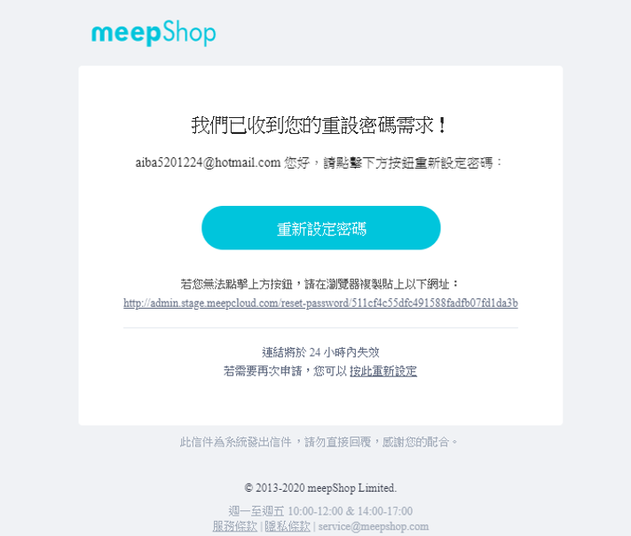 感謝您選擇 meepShop,您將會收到我們寄給您的第一封信,信件內會提供您商店登入帳號與初始密碼。