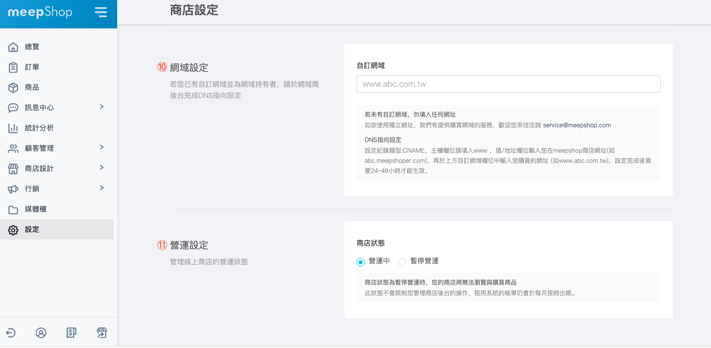 商店設定包含:商店資訊、前台語言貨幣、後台介面、網域及營運設定。