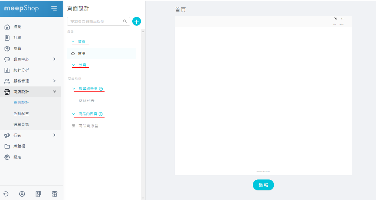 meepShop系統後台依造頁面類型,分為「 首頁」、「分頁」、「搜尋結果頁」及「商品內容頁」,各類別的詳細說明請至 架構規劃 章節。