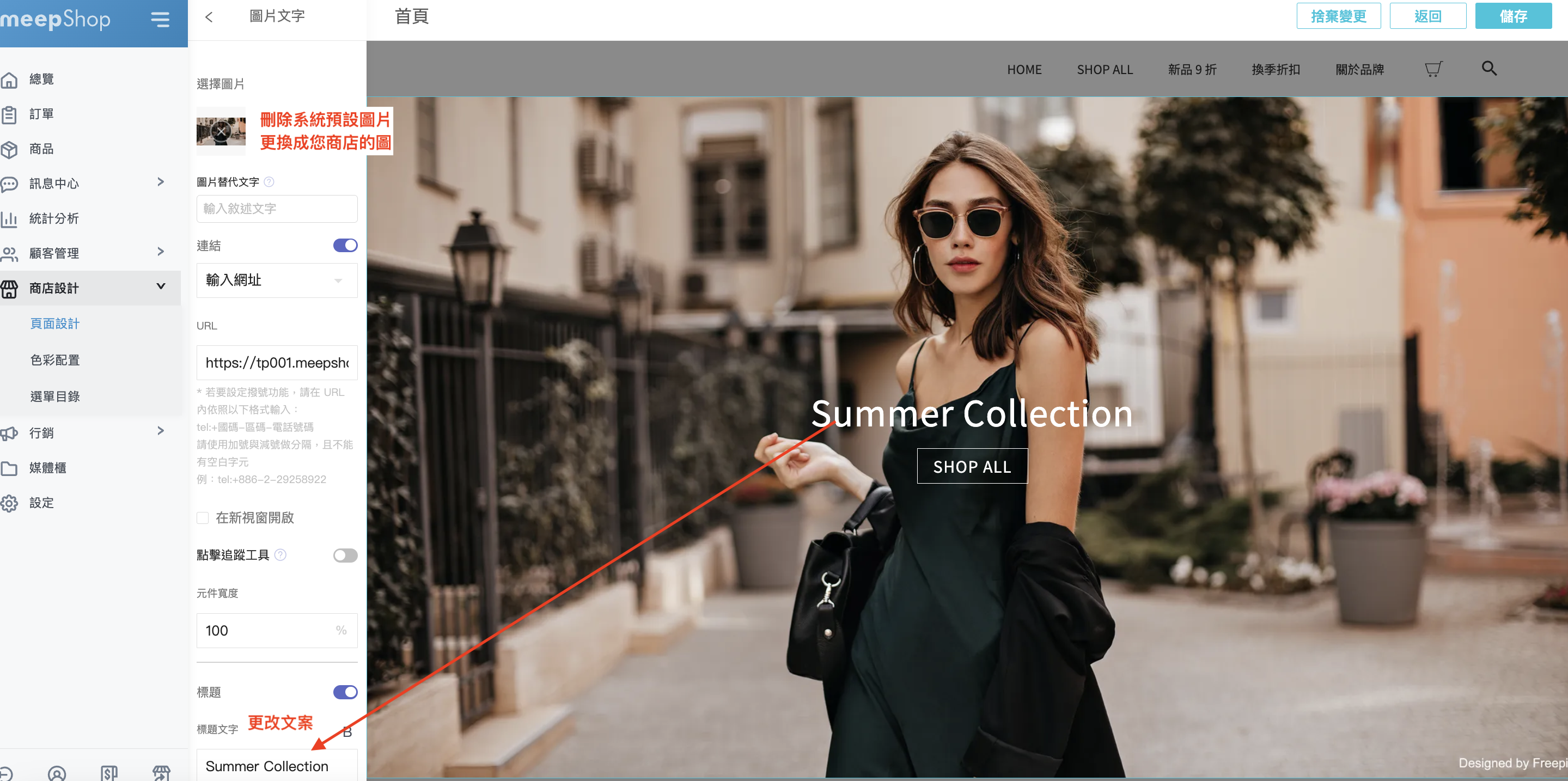 後續您可以開始將原本版型的圖片刪除,再更換成您商店的圖片即可喔!