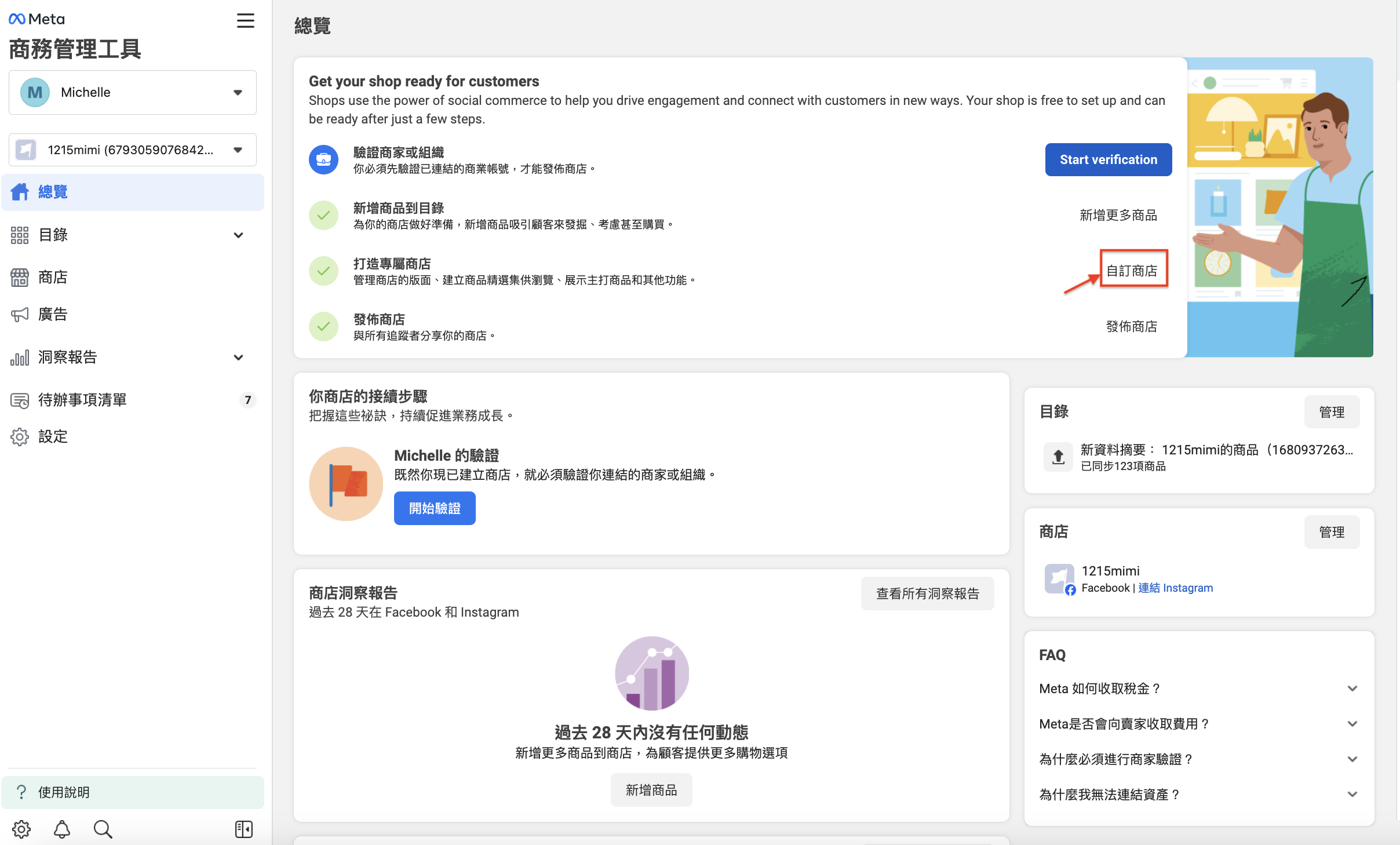 當商家驗證通過後,可點擊總覽,進入『自訂商店』