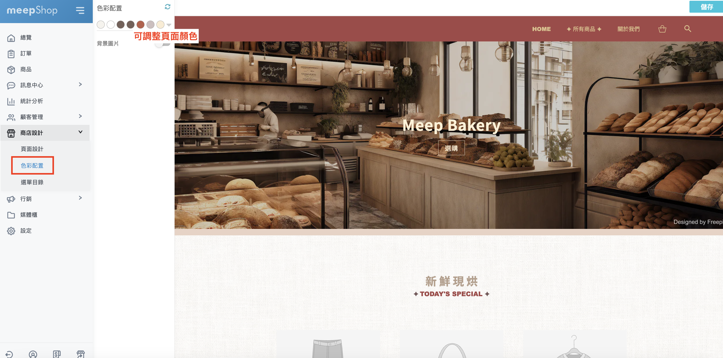 如您想要調整色調,可以到頁面設計->色彩配置進行調整,詳細設定請參考此篇
