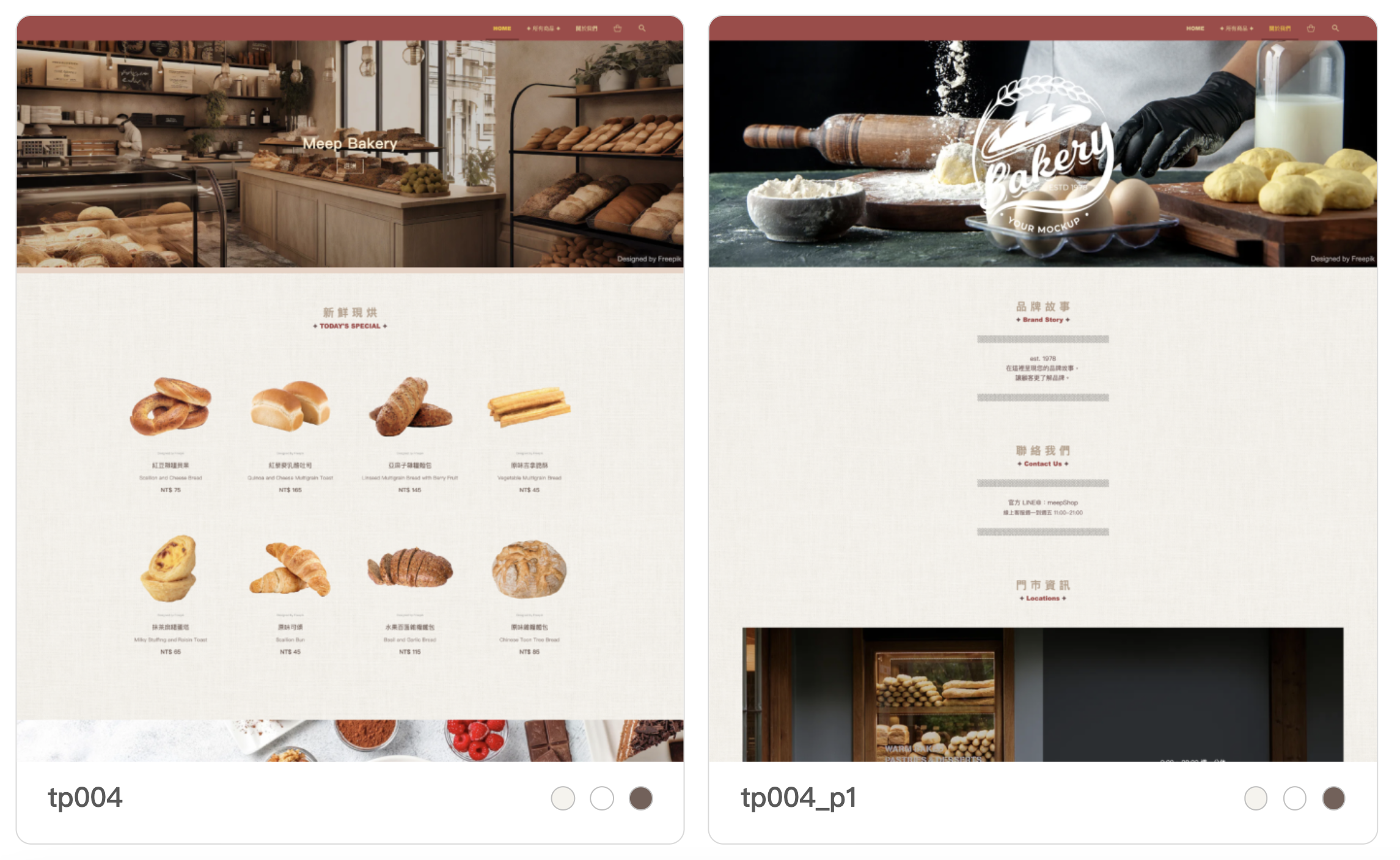 如您是新商店,首次可直接於 ①商店設計-頁面設計-> ② 選擇 tp004 套版版型 -> ③ 建立商店頁面